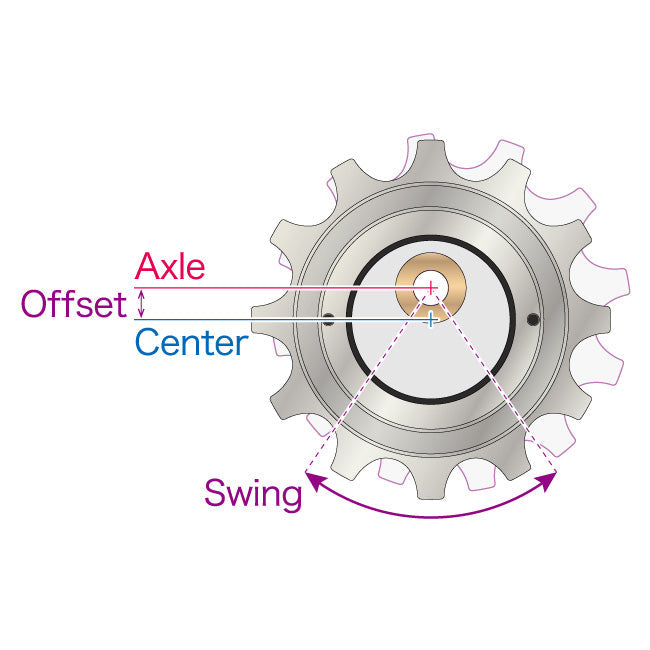 As the axle is fixed eccentrically, the pulley resonates with the motion of the rear derailleur and adjusts its position to cassette cogs automatically. So, shifting is just as accurate as it is with the original pulley.
